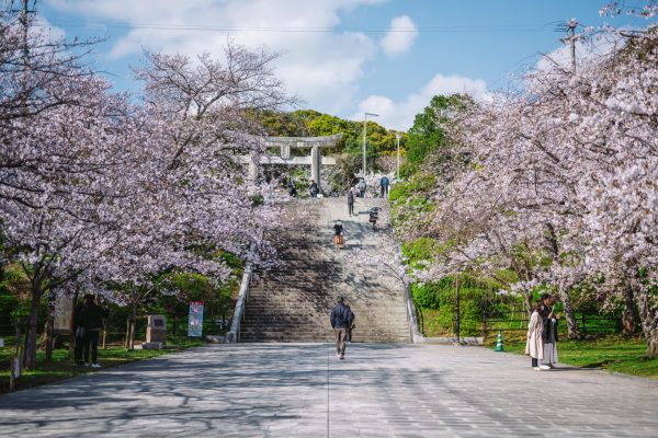 ポイント: 展望広場からは博多湾や志賀島を一望でき、海と桜のコントラストが楽しめます。