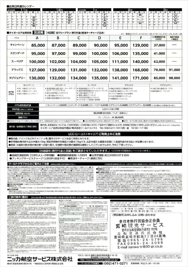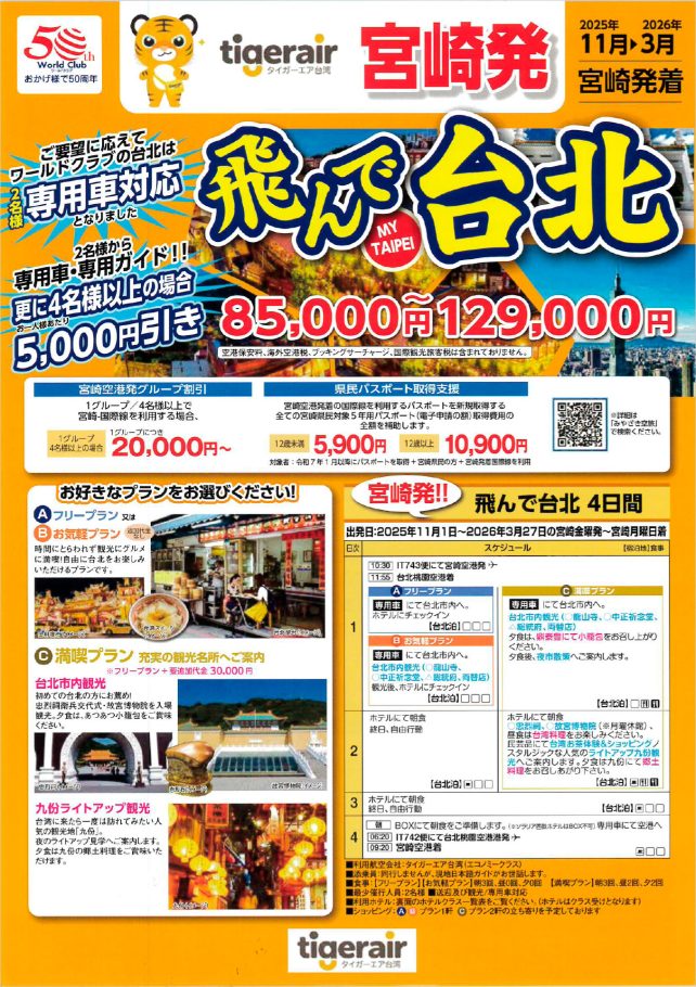 타이거에어 타이완 [미야자키 출발/도착] 타이베이 4일 타비콘 큐슈를 이용해 주셔서 감사합니다. 現在、たびこん九州を運営する三和交通株式会社では『【宮崎発】飛んで台北 4日間』のツアーのご予約を承っております。ぜひご利用ください。 예약・문의】예약전화0985-24-5796 전단지 다운로드(PDF 파일)>> 전단지 다운로드하기