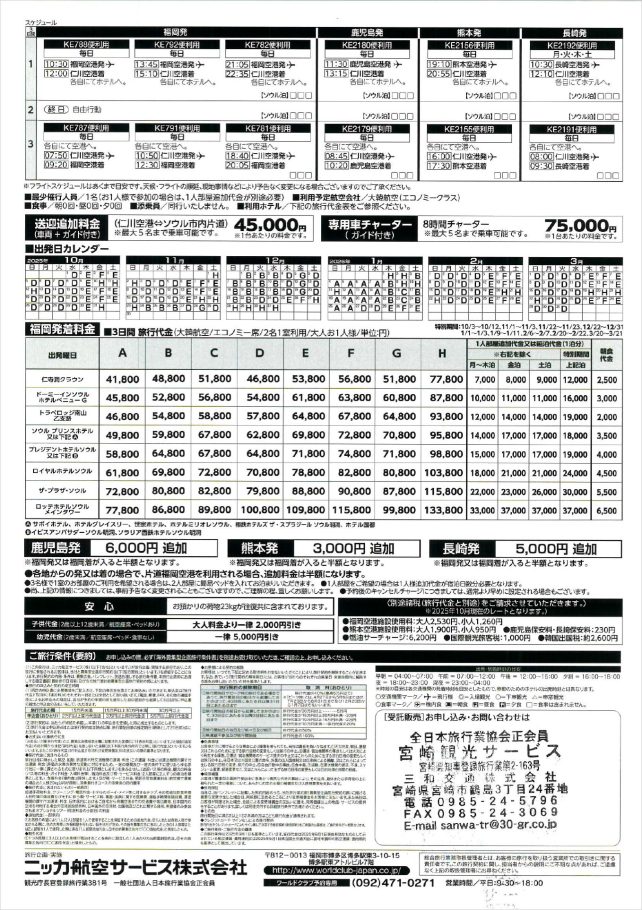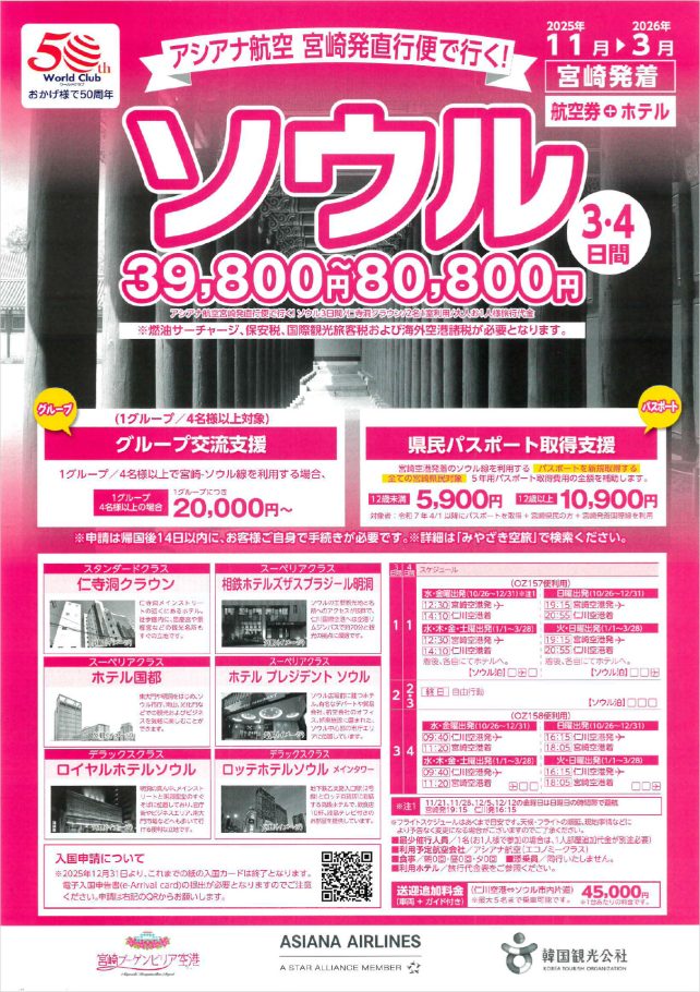 아시아나항공 [미야자키 출발 직항편]으로 떠나는 서울 여행 타비콘 큐슈를 이용해 주셔서 감사합니다. 現在、たびこん九州を運営する三和交通株式会社では、アシアナ空港で行くソウル3・4日間のツアーのご予約を承っております。ぜひご利用ください。 예약・문의】예약전화0985-24-5796 전단지 다운로드(PDF 파일)>> 전단지 다운로드하기