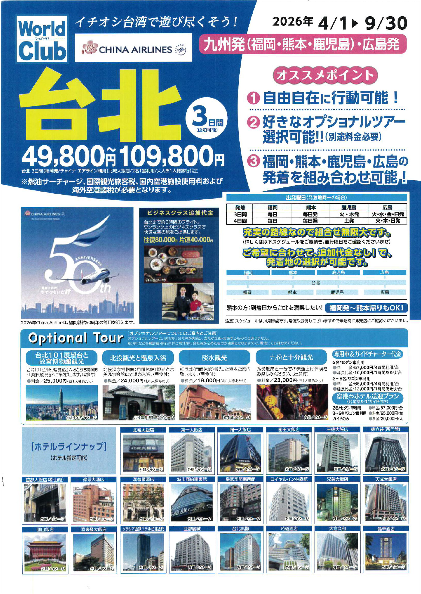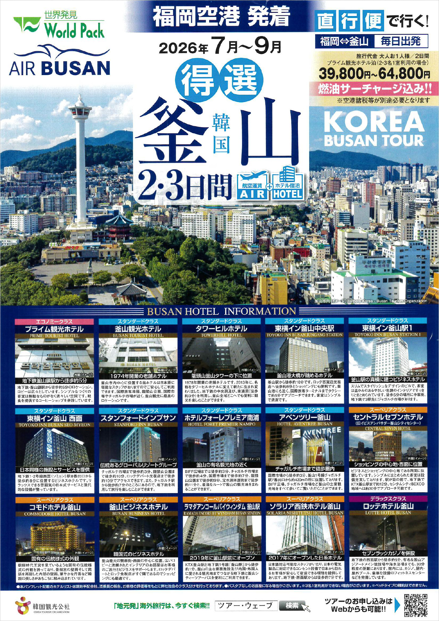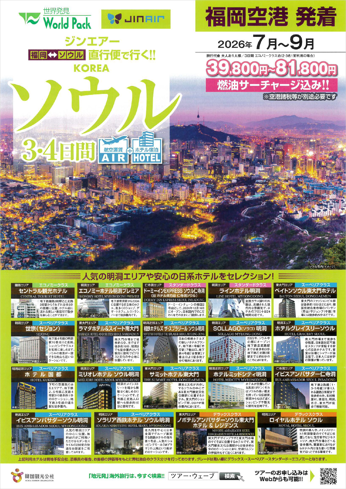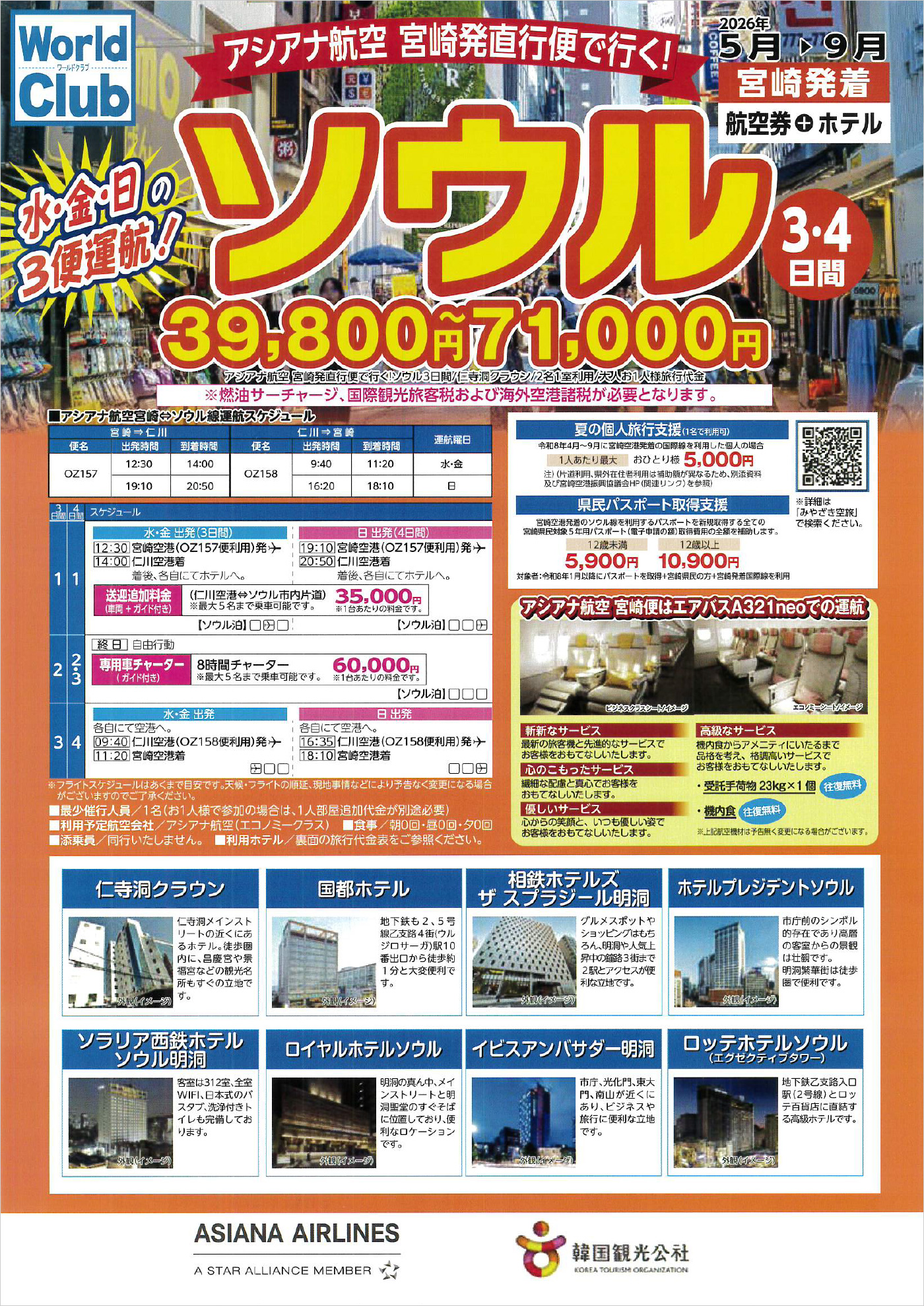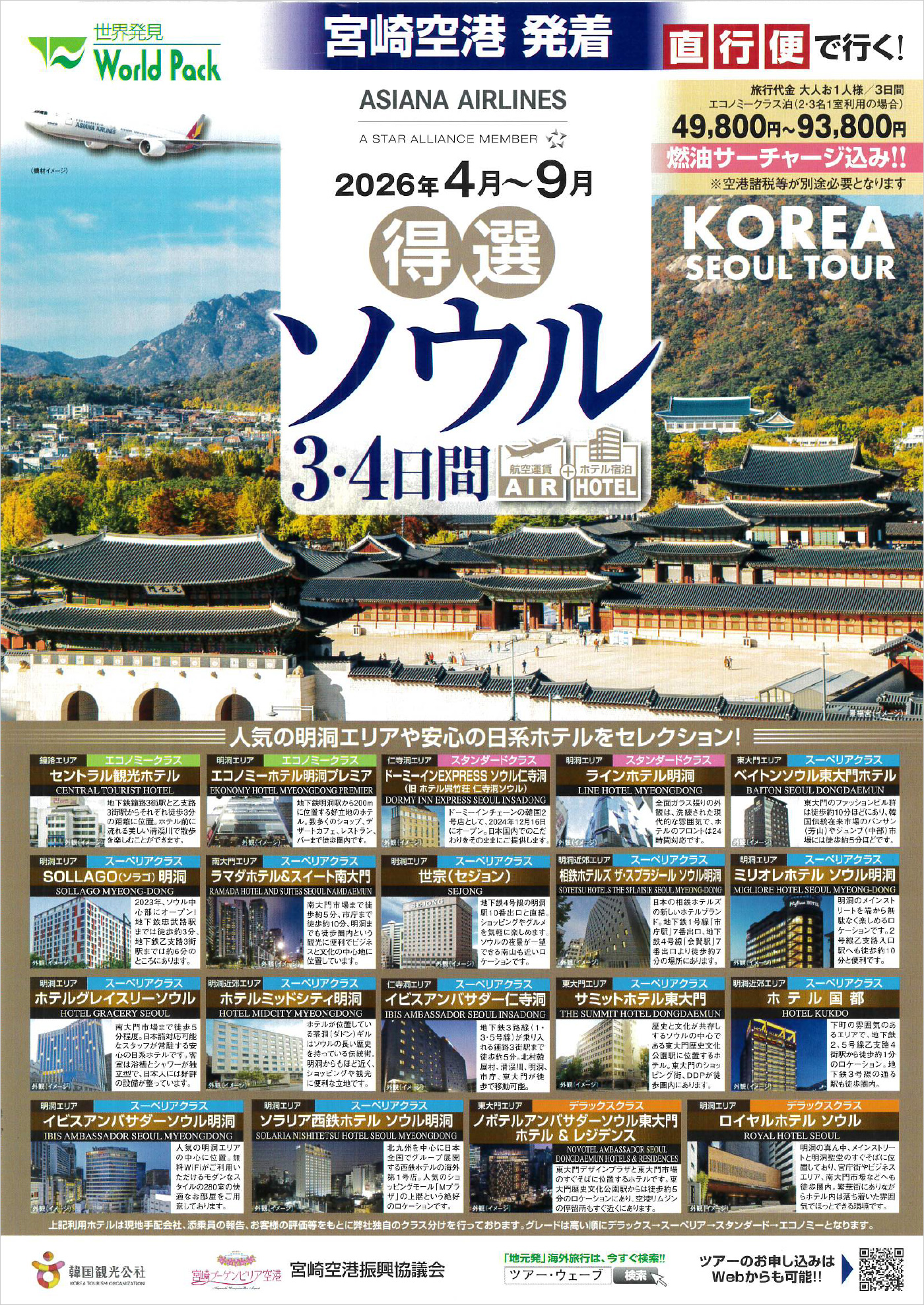 直行便で行く! ソウル・釜山・台北の旅 たびこん九州をご利用いただきありがとうございます。 現在、たびこん九州を運営する三和交通株式会社では、ソウル・釜山・台北へ3・4日間のツアーのご予約を承っております。ぜひご利用ください。【ご予約・お問い合わせ】電話 0985-24-5796 ■チラシをダウンロードする(PDFファイル)>>